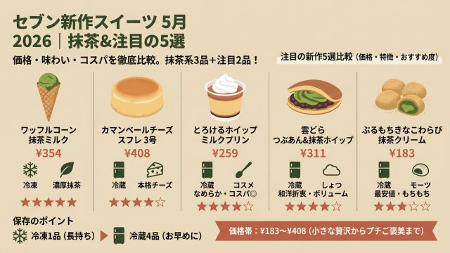 2026年5月のセブンイレブン新作スイーツ5選を価格・味・コスパで徹底比較。抹茶ワッフルコーンやチーズスフレなど注目商品の選び方と保存の注意点もお届けします。